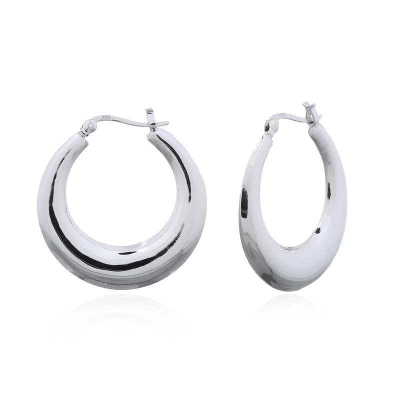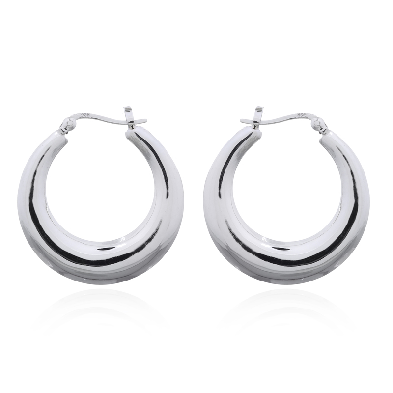 Reflecting fabulously the light on the smooth convex surface these 30mm diameter Sterling Silver Hoops earrings generate a stylish eye-catching look. Timeless Hoops of the classy type are favorites of women adding a conspicuous jewelry to their wardrobe that matches most clothing styles and that accentuate easy all colors with their brilliant shine. High polished and secured with French locks these earrings will always be in fashion.
