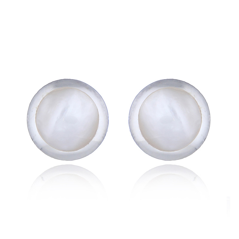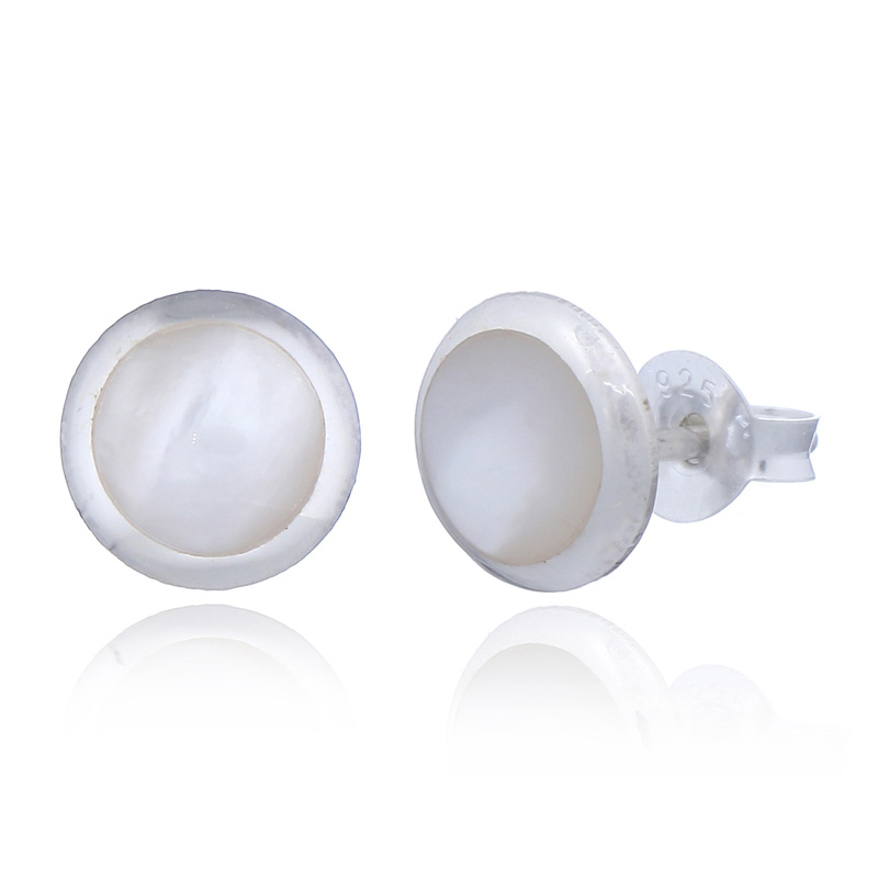 The thin lightly convex mother of pearl shell on this on this pair of sterling silver ear studs itself measures about 5 mm in diameter. Both pieces of the beautiful MOP shell display a mostly off-white color with an occasional iridescent effect. Simple but elegant for its quality and natural materials this is a pretty pair of MOP ear studs.