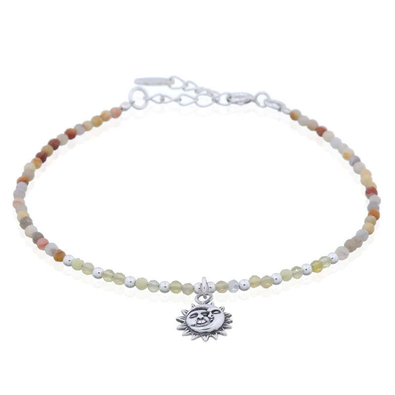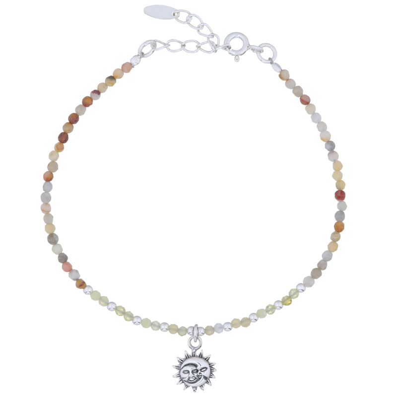 This bracelet is a stunning piece of jewelry that combines the natural beauty of crazy agate and yellow opal with the elegance of 925 sterling silver. The bracelet features round faceted beads of crazy agate in various colors, from light purple to green to orange, creating a vibrant and eye-catching contrast with the yellow opal beads. The bracelet also has a sun and moon charm made of 925 sterling silver, symbolizing the balance and harmony of nature. The bracelet is adjustable via an extender chain.