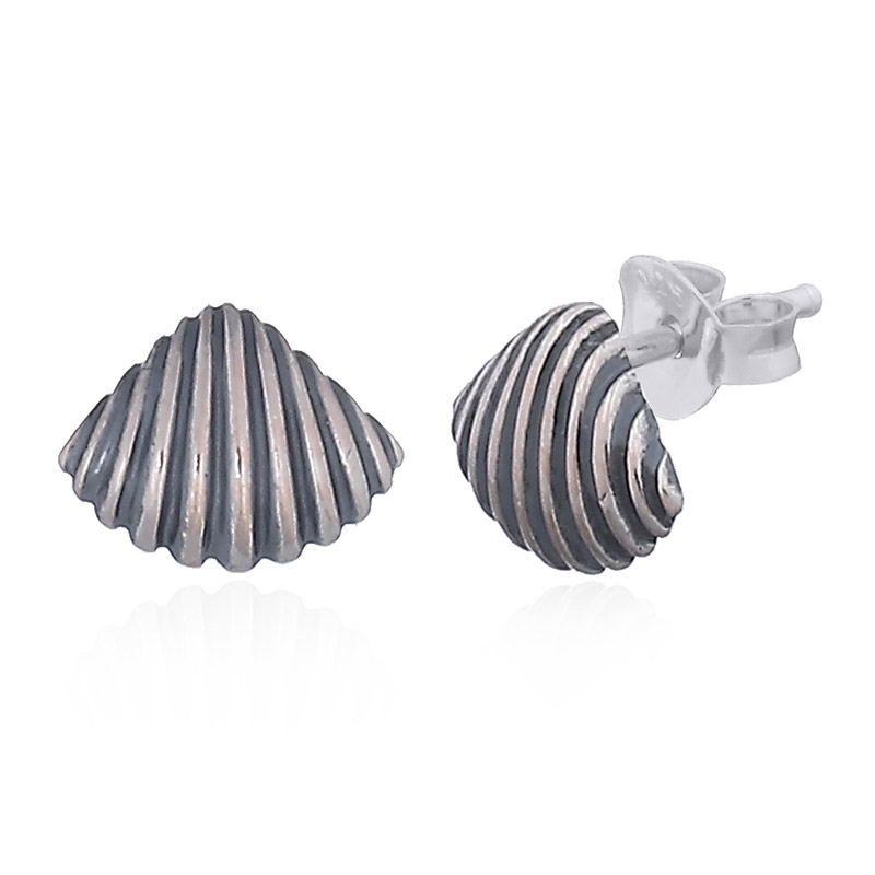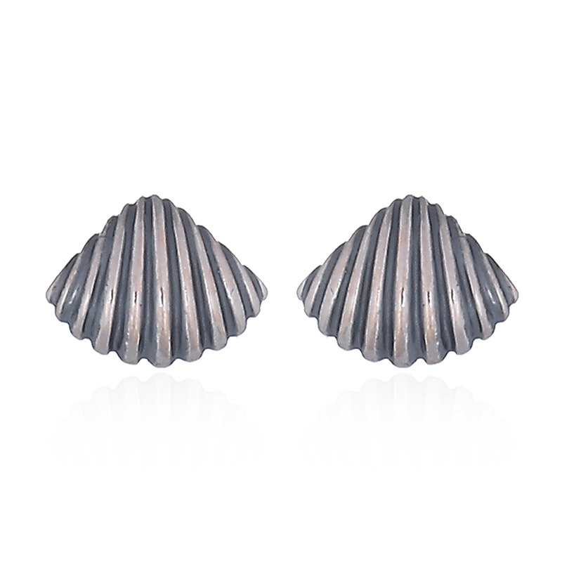 Ornate Silver casted in cockle shell as stud earrings with polished silver butterfly closure.