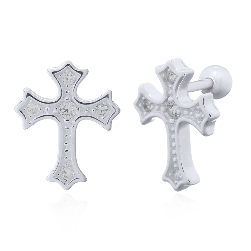 Featuring a sparkling cubic zirconia cross, these stud earrings combine meaningful faith symbolism with timeless elegance. Crafted from 925 sterling silver, they offer lasting shine and comfort, making them perfect for everyday wear or special occasions. A secure screw ball closure ensures the earrings remain in place. A graceful addition to any collection, ideal for customers seeking jewelry that blends style with significance.