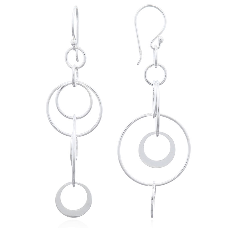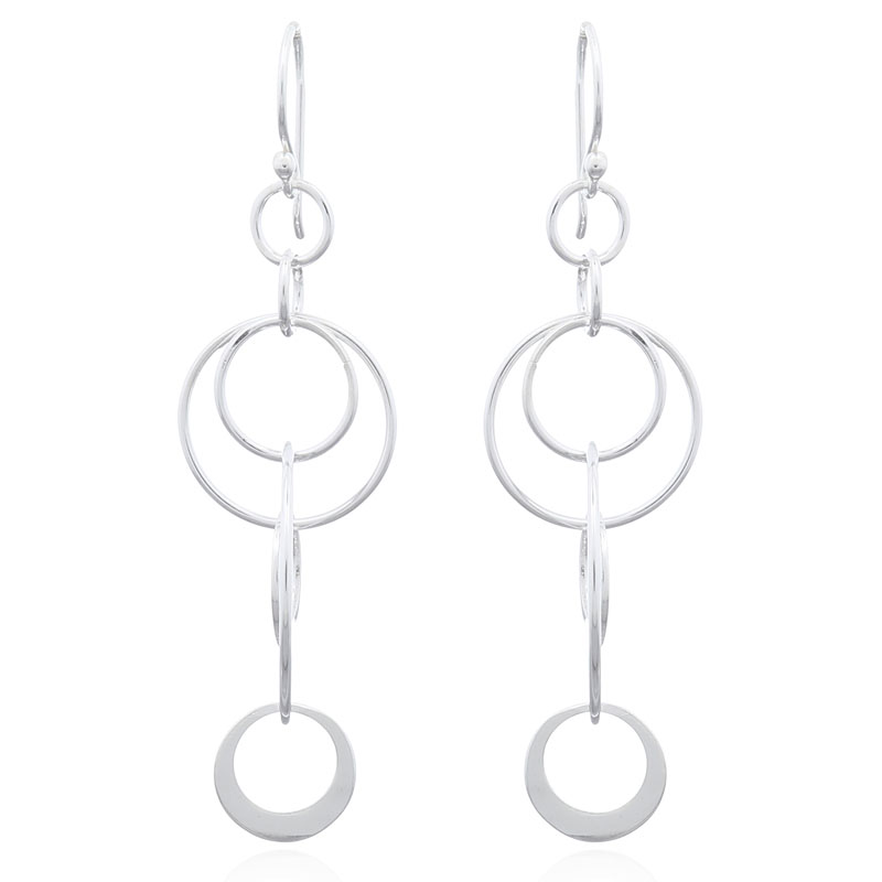 925 Sterling Silver Dangle earrings feature interlocked various sized hoops that range in diameter from 6-19 mm and are arranged to a bright shining silver transparent cluster that dangles delightfully on swing loops. Flanking the features with eye-catching silver earrings that have a young fashion silver jewelry flair and complement perfectly an up-do or short hair with a playful style makes these earrings popular with the young women and girls that love the attention catching effect when they showcase these Danglers.