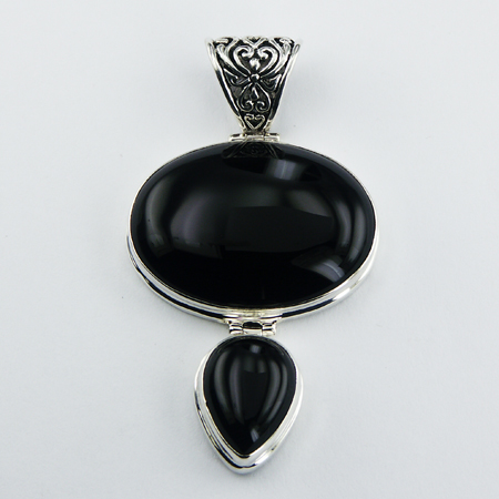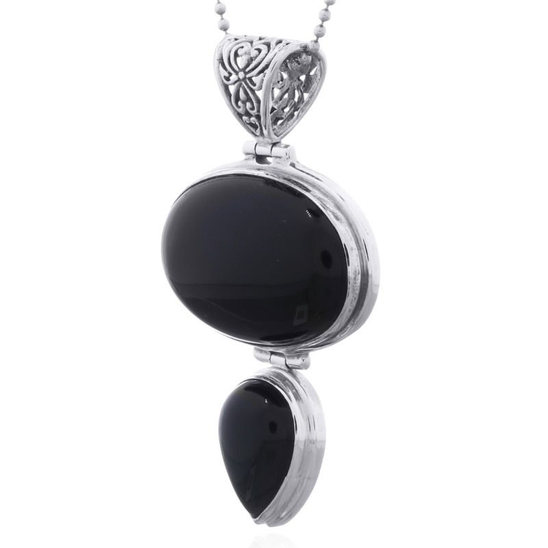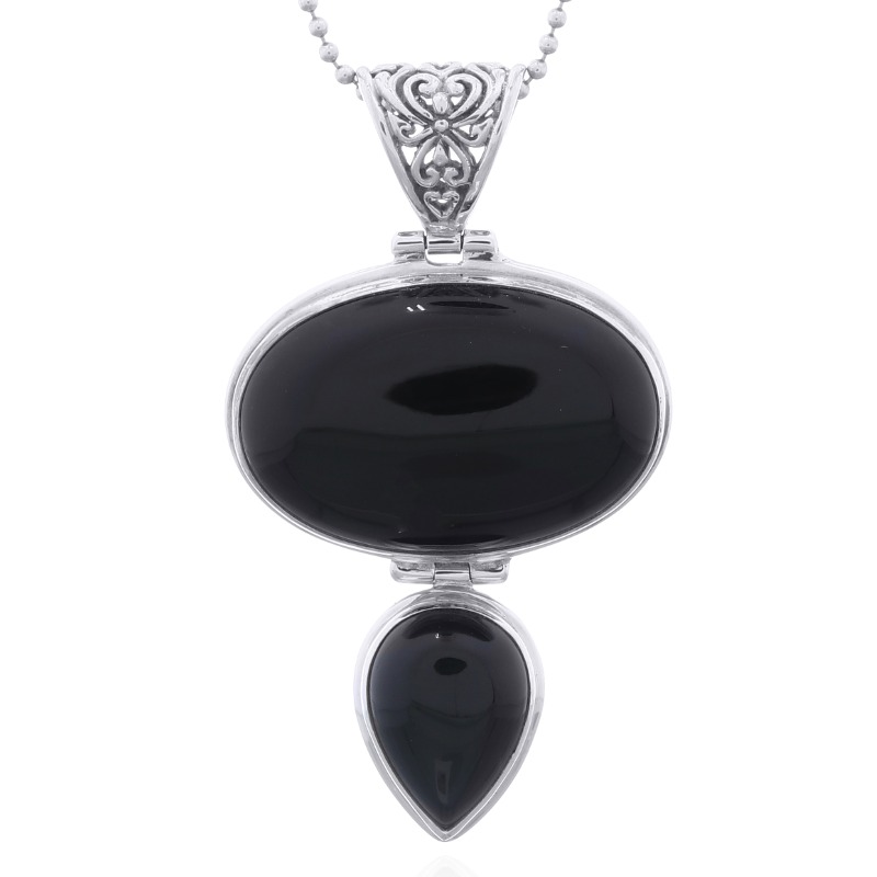 Sterling Silver gemstone pendant features beautifully convex horizontally aligned oval and fancy pear shaped Black Agate gemstone cabochons at bottom delightfully set in high polished Hallmarked 925 silver. Interconnected by hinges to the stunning Ajoure silver bail this gorgeous silver gemstone jewelry is all handmade bringing a sophisticated style to the neckline. The mix of shapes and crowned by the ornamental bail this Black Agate pendant shows a unique jewelry design that will dress up and complete an outfit elegantly.