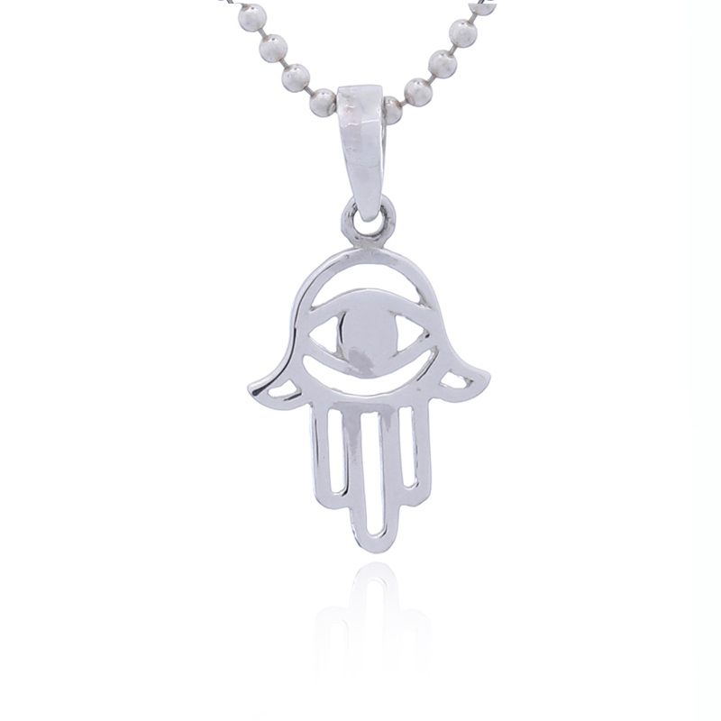 Made of relatively simple lines this 925 silver pendant is a very clean and minimalist design that nevertheless is very well identified as a hand of Fatima with an evil eye. The hand of Fatima is of middle eastern origin that it’s said to bring its owner good fortune.
