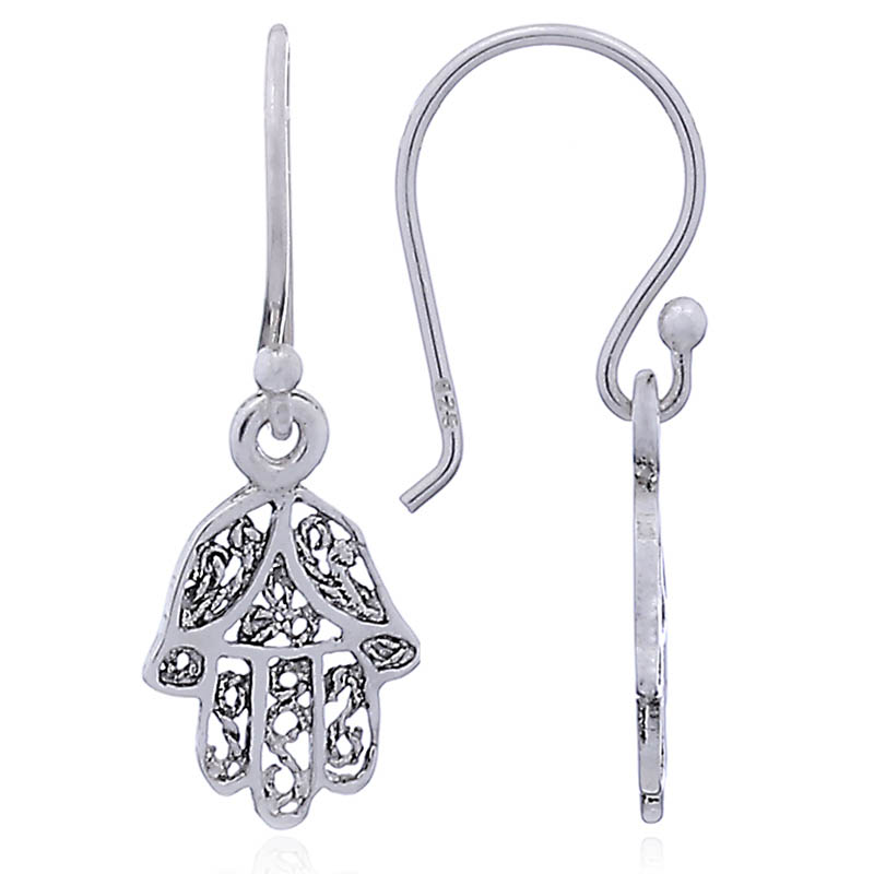 Hamsa hand earrings made in sterling silver show the main open spaces of both hands filled in with antiqued rope-like silver lines to create an interesting look.
