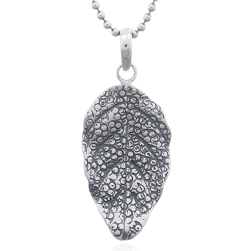 This sterling silver leaf pendant showcases an undulated profile with a packed circle surface, offering a unique design that exudes natural beauty. Retailers can appeal to customers who love organic shapes and nature-inspired themes. An eye-catching addition to any collection.