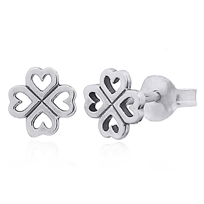 Four-leaf clover stud earrings manufactured in 925 silver show precise open heart shaped leaves and earring posts with butterfly backs are attached firmly to their backs. A four-leaf clover is according to tradition supposed to bring good luck and protect against evil.
