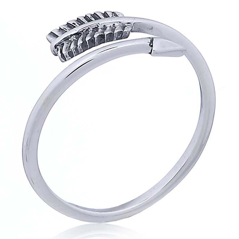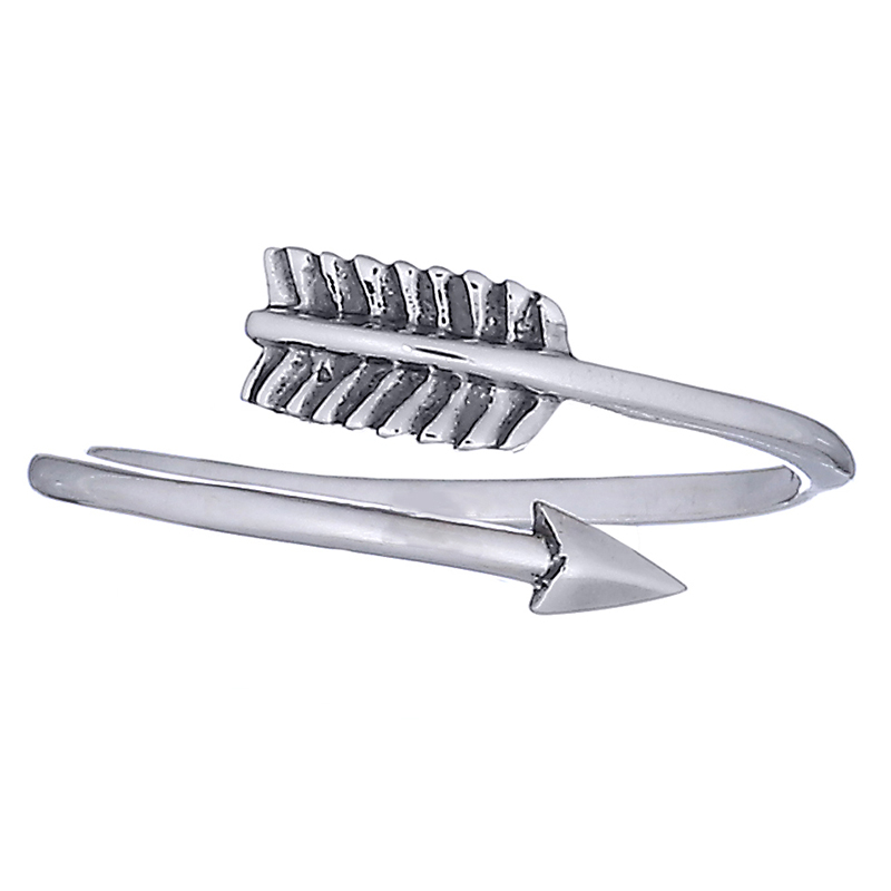 Sterling silver ring representing a Cupid’s arrow. The shaft of the arrow coils around the finger and shows the arrow’s vane in the shape of a feather on one end right next to it on the other end the arrowhead which is not sharp whatsoever. A very cute and dainty open silver ring that has lots of meaning.