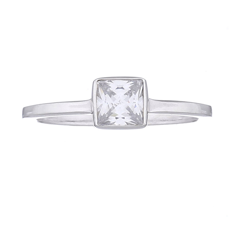 A squared clear CZ stone is set on a 6×6 mm mount on top of this polished sterling silver ring. The shank of the ring presents a squarish look with beveled corners to prevent any rough edges. Wholesale silver ring with CZ manufactured with care while adhering to strict quality controls.