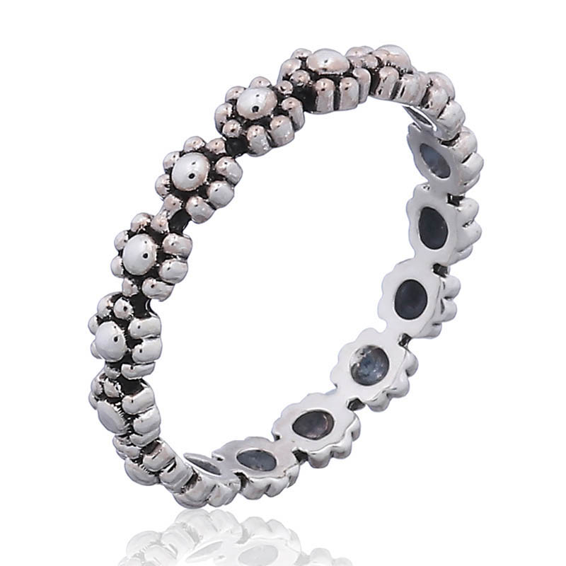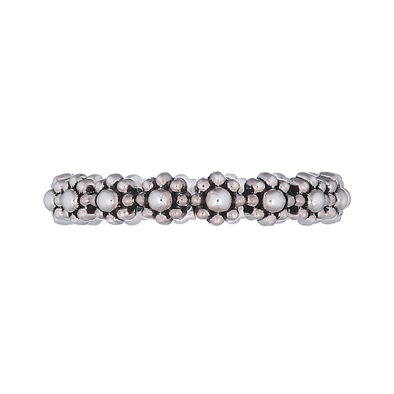 Ring cast in sterling silver shows a neat row of identical flowers created by circular shapes.