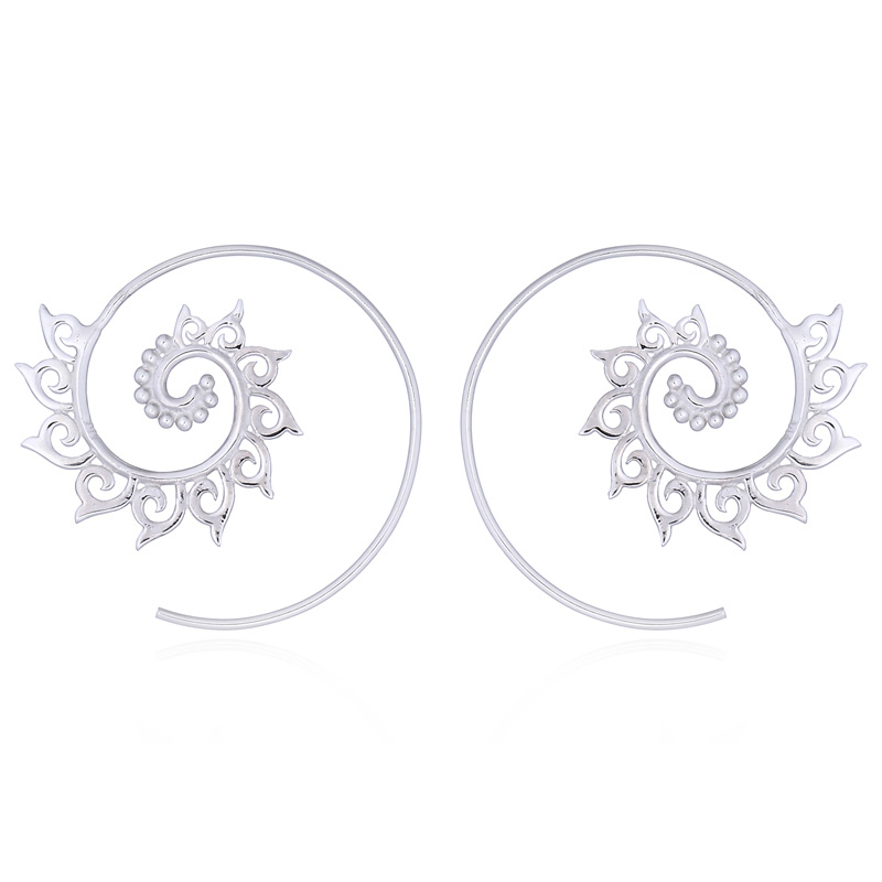 As if inspired by fractal geometry the repeating swirly shapes repeat themselves over an over while decreasing in size as they approach the inside of the silver wire spiral. Intriguing silver tribal spiral earrings that are easy to use.