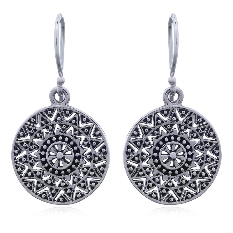 Attractive sun-like mandala silver earrings consisting of a pattern of triangles and dots. Tiny gaps are created between the different rows of triangles that nearly seem to engage introduce light and contrast to the antiques silver finish. These fascinating wholesale mandala earrings are a good investment.