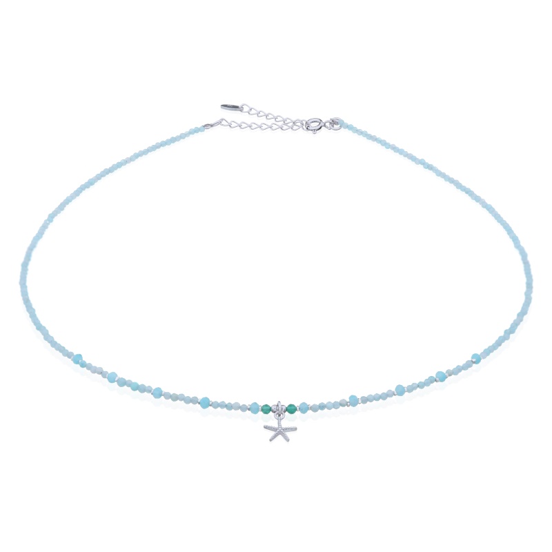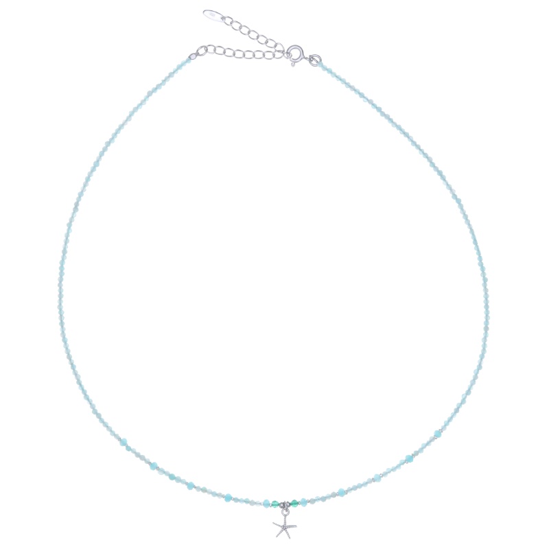 This charming necklace combines a 925 starfish charm with green agate and amazonite, perfect for adding a coastal touch to any outfit. The vibrant colors and playful design make it an ideal accessory for beach lovers. Offer this delightful piece to your customers today!