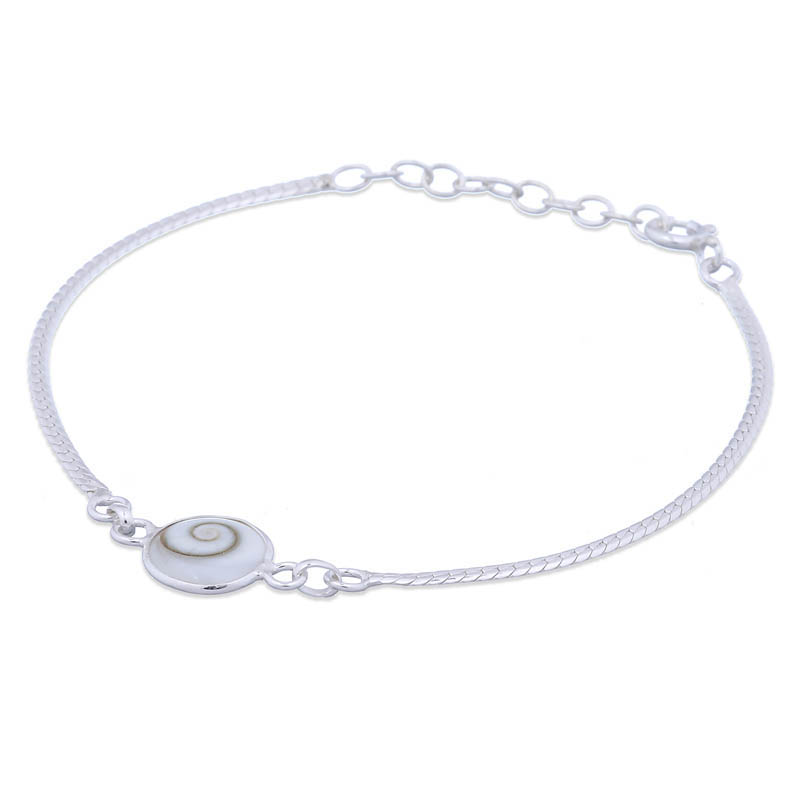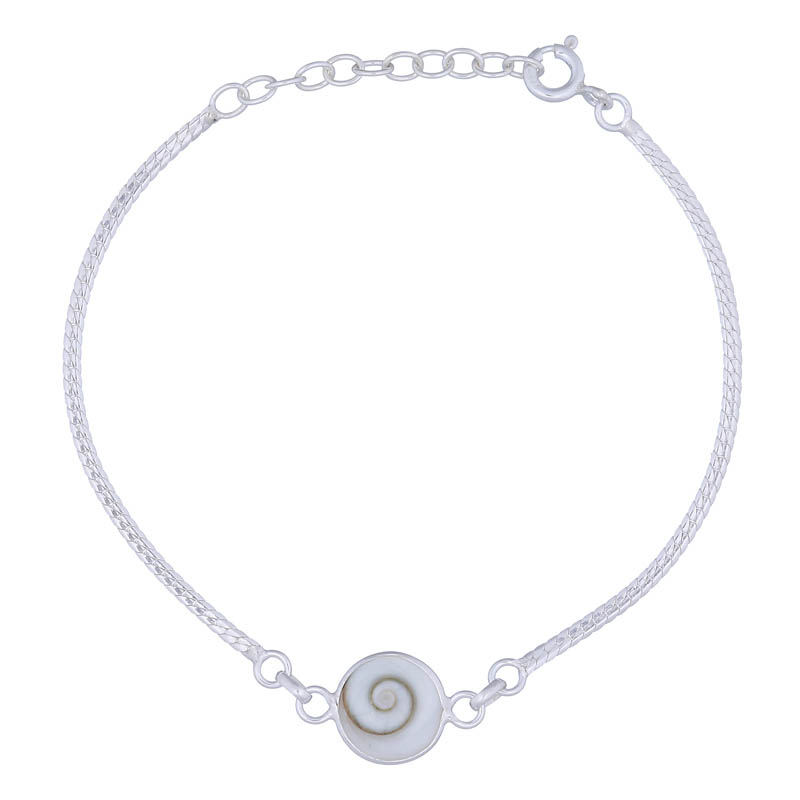 1 mm thinness chain in bracelet is snake chain design and layered. 10 mm circle charm was made up by Shiva Eye shell.