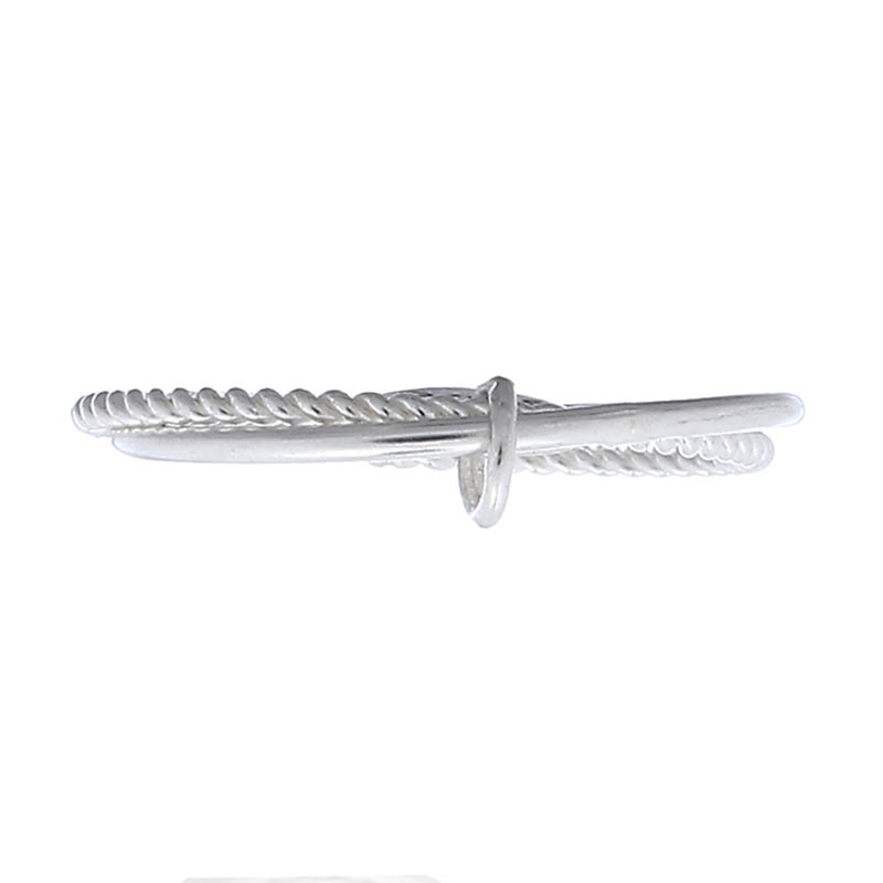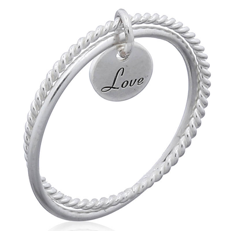 Two stackable rings are twined each. One plain ring and one is a twisted rings. Also have a lovely disc charm that is engraved a meaning ” love”. It is very cute gift for girls and so romantic to give your girlfriend.