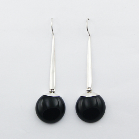 Black Agate round cabochons magnificently polished are clasped in Sterling Silver and hinged to the lovely stick hangers creating a pair of feminine gemstone Drop earrings. Secured with fixed hook these earrings flatter the features of a woman delicately with a fine bright shiny silver line and contrasting convex gemstone discs.