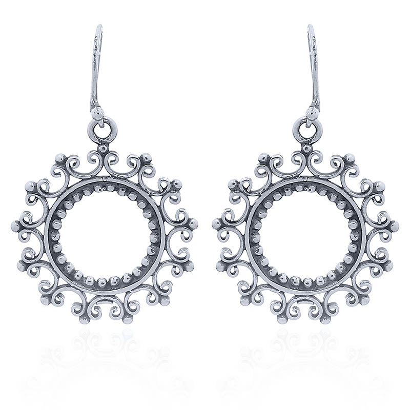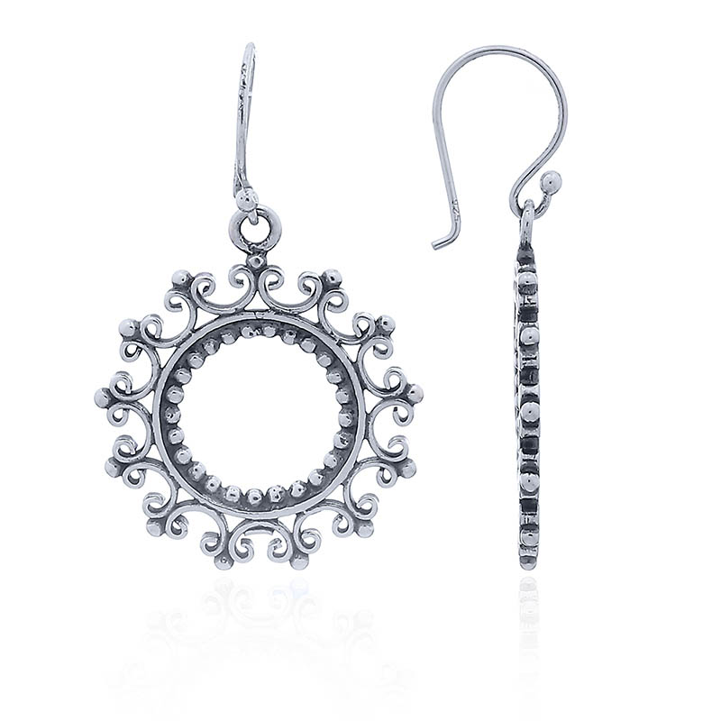These Sterling Silver stylized sun earrings are a delicate creation of Ajoure ornaments mounted to an open circle with tiny silver beads attached on its inside. This Vintage Style composition has a sensible and fine vibe to it.