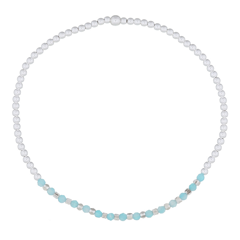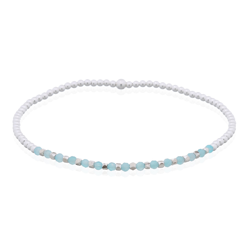 This stretchable bracelet features amazonite stone beads paired with sterling silver, creating a soothing color palette. Its adjustable fit and timeless design make it a popular choice among retailers aiming to cater to customers who appreciate unique, handcrafted jewelry.
