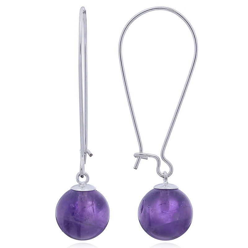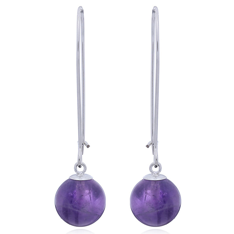 Handcrafted Amethyst gemstone balls Sterling Silver earrings feature the flamboyant polished balls clasped in adorable silver caps at top dangling on their welded ring on the generous long curved wire that are secured with leverback clasps. Young and fresh earring design that appeals to women of all ages! The breeze of silver escorted by the vivid violet glow of the Amethyst produces gorgeous gemstone silver jewelry that is fun to wear and a pleasure to put on flanking the features with its playful style these Amethyst earrings are versatile. Ideal silver earrings to wear at work or other daily obligations that pep up the looks.