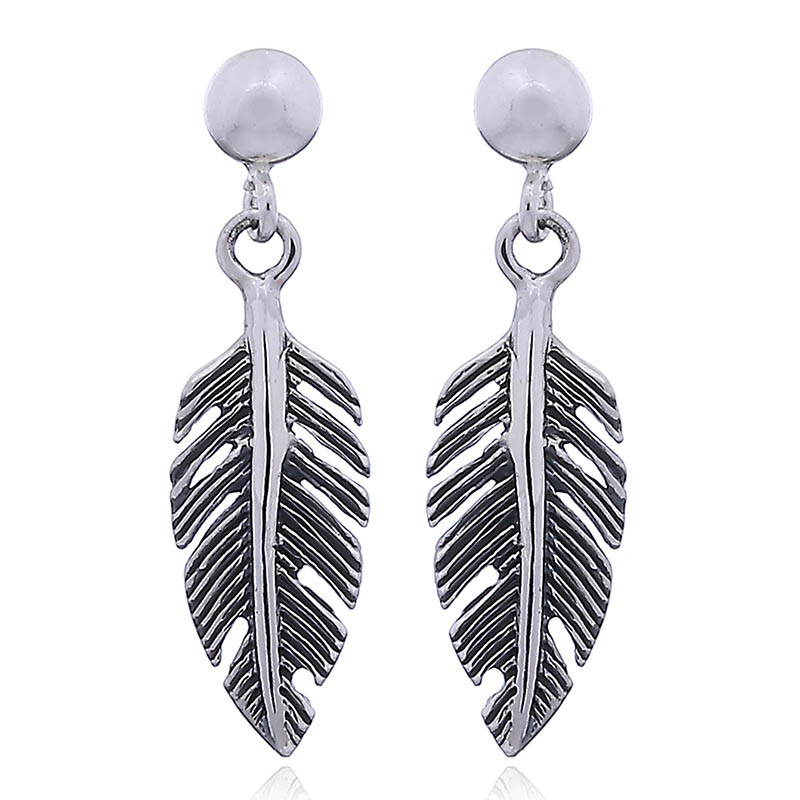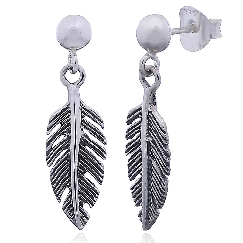 Feather in triangle drop and made carefully every single streamlines by oxidized silver. 4 mm little polished round is hanging it.