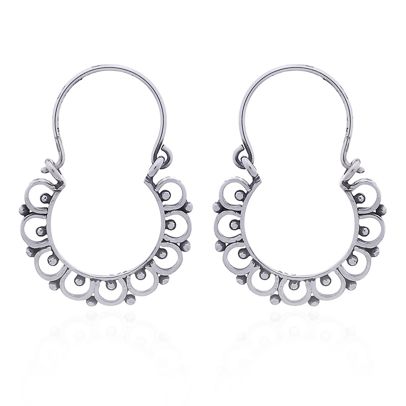 Antique replica Planet Silver designer Hoop earrings embellish women with delicate and superbly crafted 925 Sterling Silver earrings that look stunning and flatter the features enormously with a romantic and gentle silver jewelry that is reproduced and manufactured by Planet Silver. 3/4 Hoop surrounded by dainty open flower petals that hold tiny spheres in their center and are separated by tiny silver spheres in between generating a beautiful luster which is emphasized by the sparingly applied antique finish. Secured hinged U shape wire generously sized this fastening sets its distinct accent to this pair of feminine silver Hoop earrings.