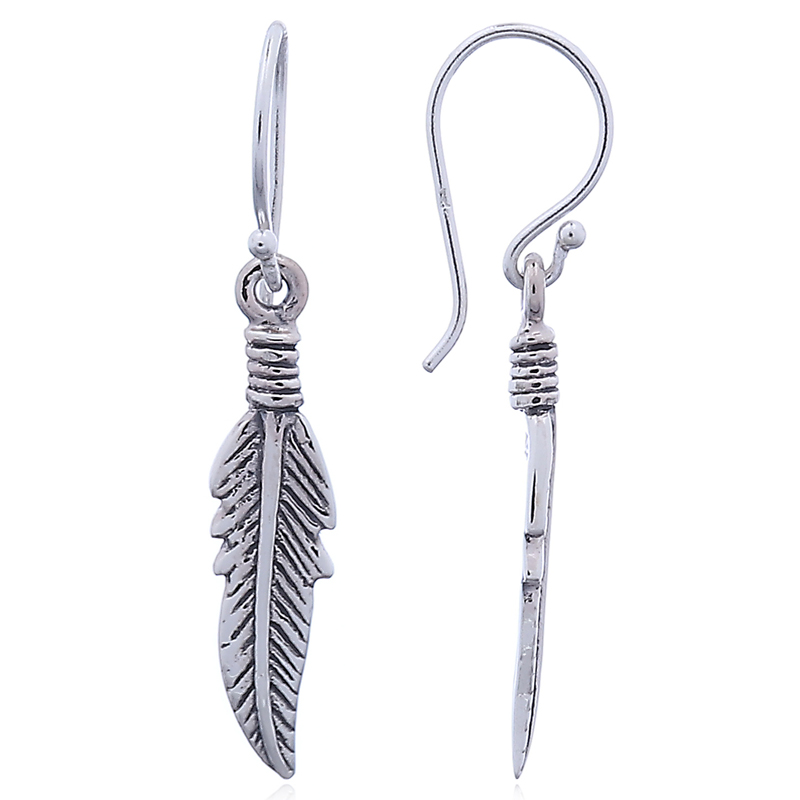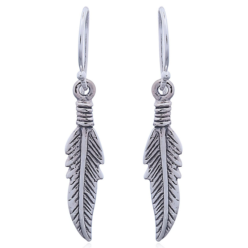Graceful and finely styled the ornate Sterling Silver is beautifully accentuated with antique finish to emphasize the fine structure of the feathers that make pretty Dangle earrings. Adding a Ethnic look to the style that reminds of the Native North American Indians that decorated themselves with feathers for festive occasions these fine earrings add their decorative effect. Very popular silver jewelry that is hot and a desired adornment of the younger generation.