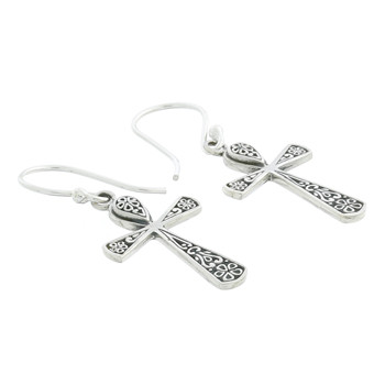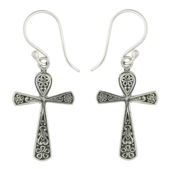 Egyptian sterling silver cross dangle earrings embellished with a ornamented design consisting of a five-petal flower on each end and curved lines that emerge from the center of the cross. The pattern is polished and set on top of an antiqued background for contrast. Silver earrings crafted by experience artisans following strict quality control guidelines.