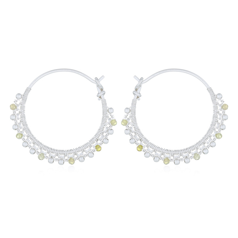 Discover the beauty of these threaded silver hoop earrings, adorned with vibrant yellow opal. Their unique design and warm hues offer customers a distinctive option that captures the essence of tropical elegance.