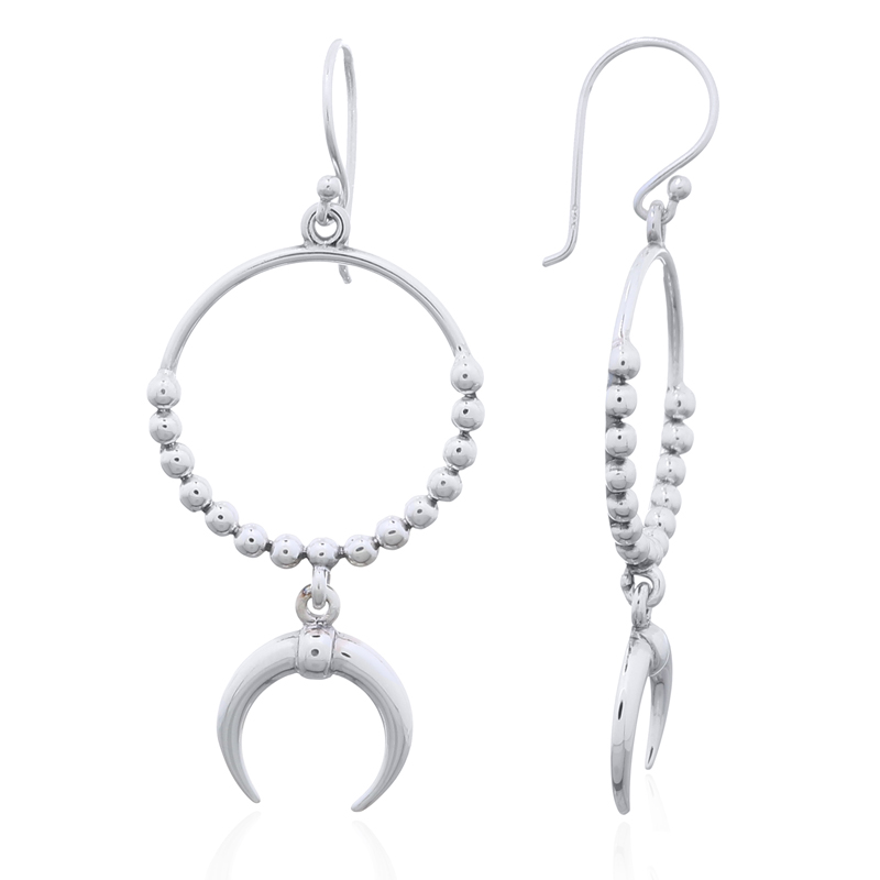 Bead hoop and crescent moon dangle earrings in sterling silver combine elegance with a touch of whimsy. Perfect for enhancing any collection. Our high-quality manufacturing guarantees satisfaction.