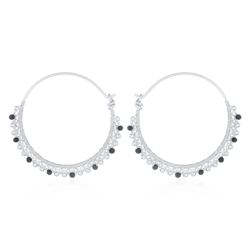 Showcase your unique style with these stunning threaded silver hoop earrings, featuring bold black agate paired with vibrant spheres. Their captivating design is sure to attract customers seeking contemporary accessories.