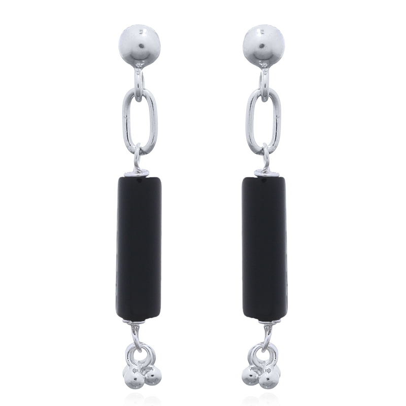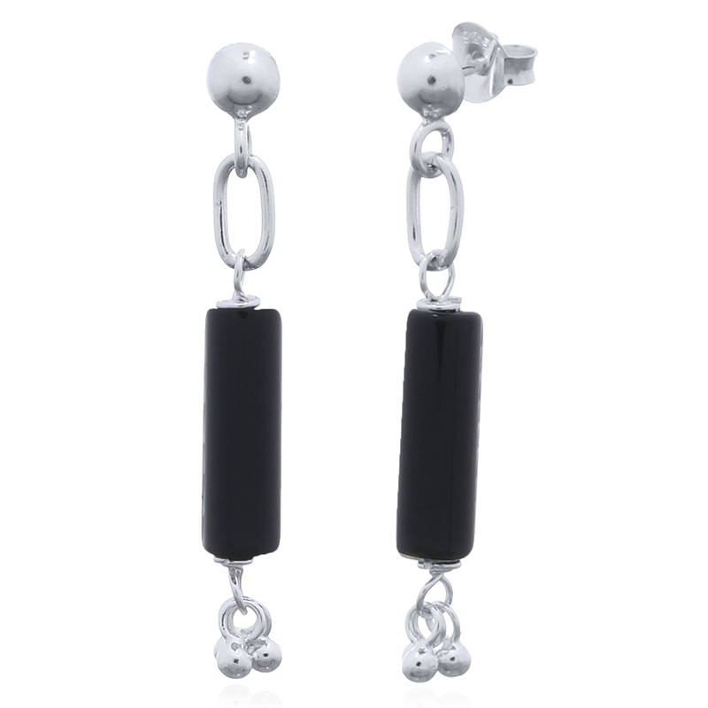 Black Agate Dangling Tube 925 Silver Stud Earrings