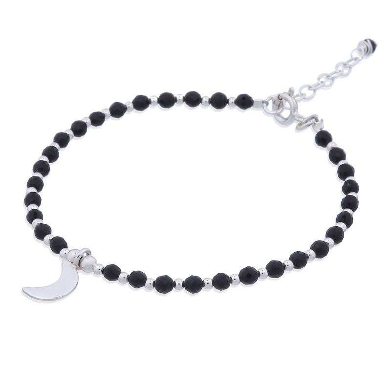 A pristine polished sterling silver moon charm of approximately 6x10x1 mm embellishes this bracelet. Faceted 3 mm black agate beads are displayed on this bracelet alternating with round 2 mm sterling silver beads to create a spectacle of great contrast. Adjustable gemstone bracelet via a included 3 cm silver chain.