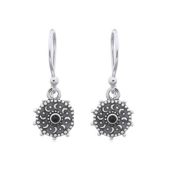 These striking dangle earrings featuring synthetic black stone and a sunflower design (with crescent moon in a circular arrangement) are a must-have for any jewelry collection. Their bold look will appeal to customers seeking unique pieces that can elevate their everyday style.