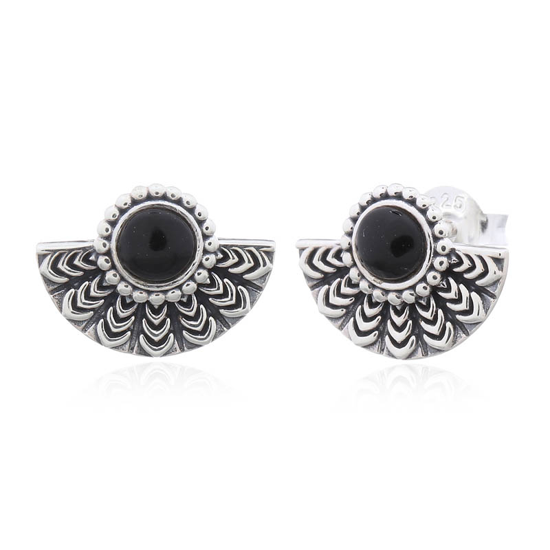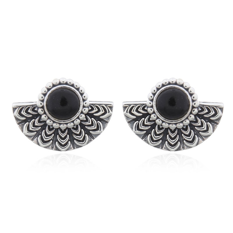 Embrace bohemian elegance with these tribal fan stud earrings featuring a striking black stone. Retailers can offer customers unique accessories that reflect individuality, making them a popular choice for fashion-forward shoppers.