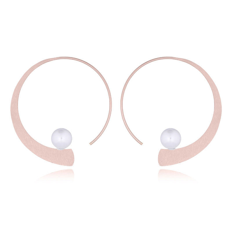 Flattened brushed finished rose gold plated semi-hoop easy to wear pair of drop earrings enhanced by Swarovski crystal pearl to add more classy and sophisticated look