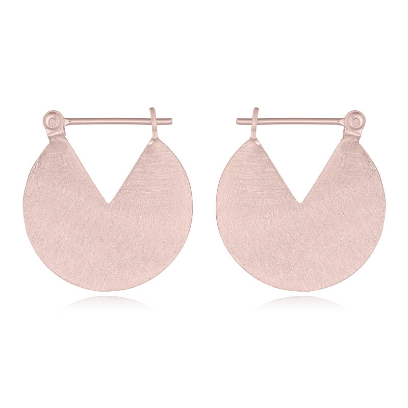 Flat disc shape with an open wedge opening rose gold plated and brushed finish create modern silver hoop earrings.