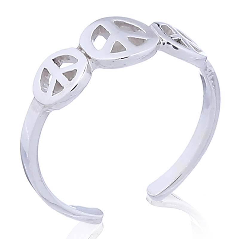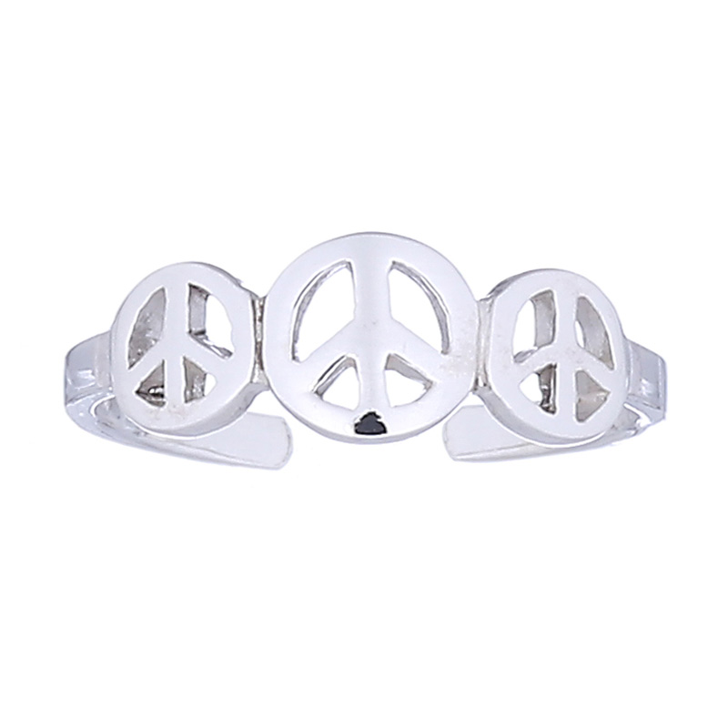 Plain Sterling Silver toe ring beautifully displaying 3 well crafted peace signs in a row. The center one being the largest peace sign surrounded by 1 smaller ones to each side. The peace symbol always composes jewelry that is popular.