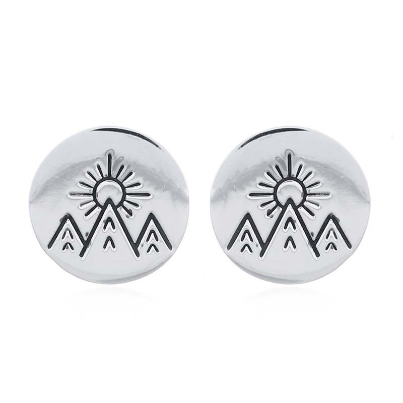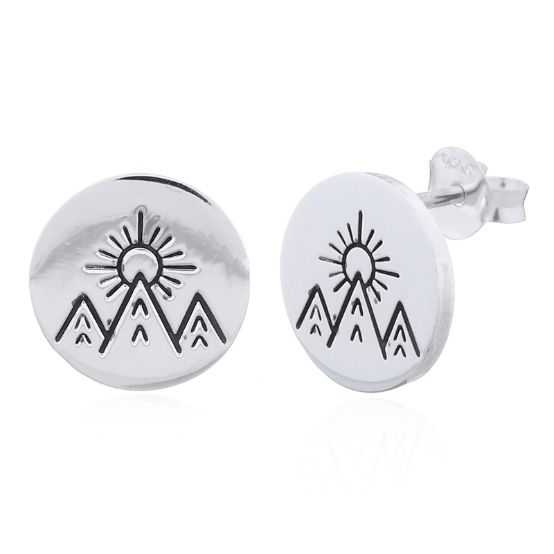 These 925 sterling silver studs feature a circle shape engraved with a mountains and sun motif. Retailers will love offering this unique, nature-inspired accessory that appeals to customers seeking subtle yet meaningful everyday jewelry.