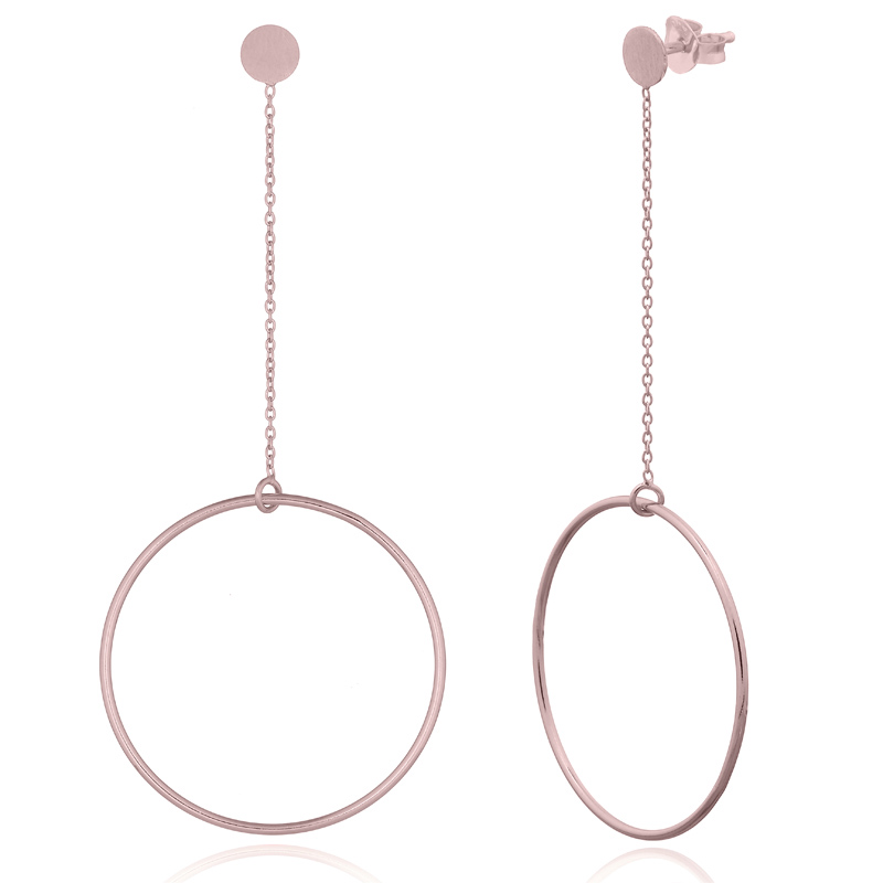 Hard wire rounded as a circle and hanging down from the brushed silver disc by thin chain. Earrings is rose gold plated and butterfly closure.