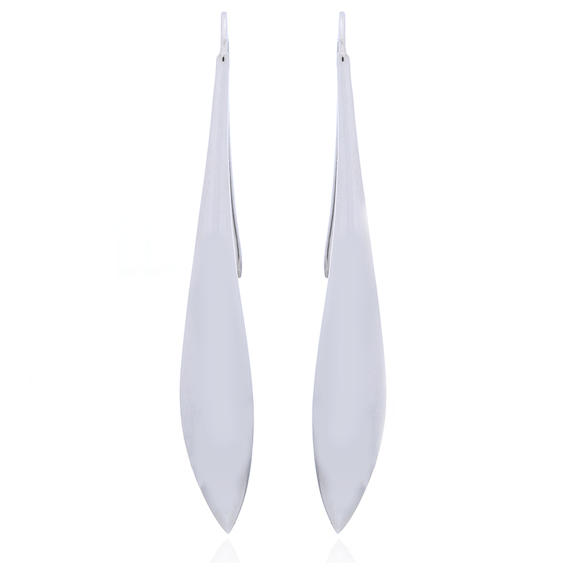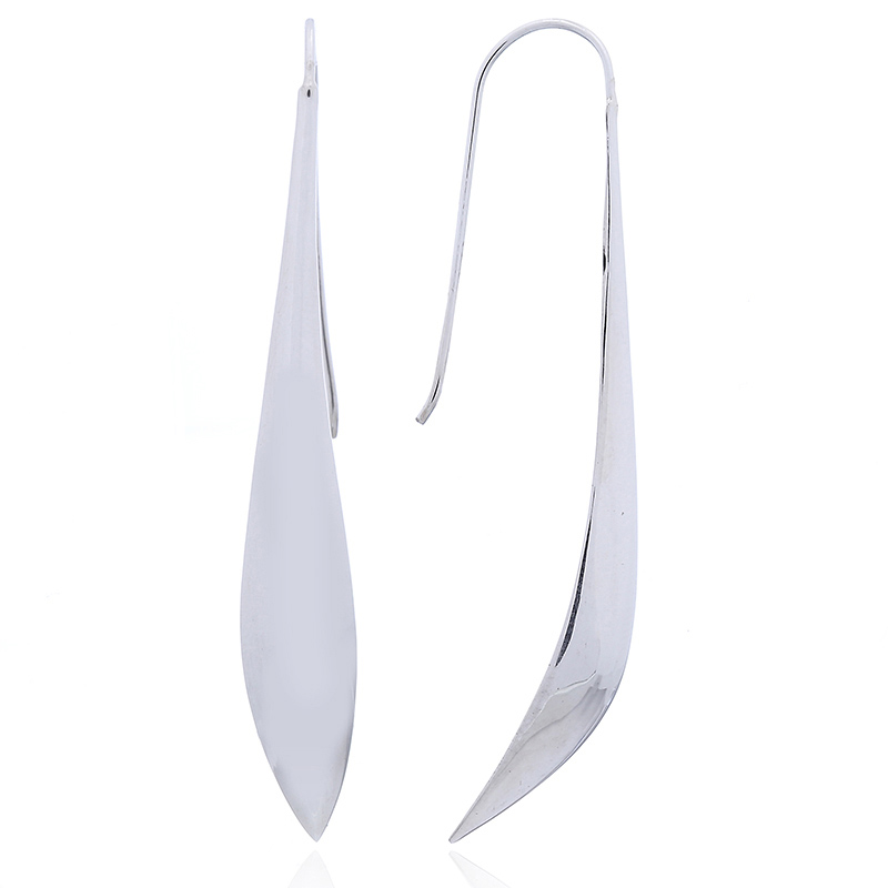 Tapered at top and bottom these earrings take on the shape of a drop half-way down just to taper again at the bottom that curves carefully inwards. Polished Sterling Silver adds some of its cool and the unusual design provides some extravagance to these earrings.