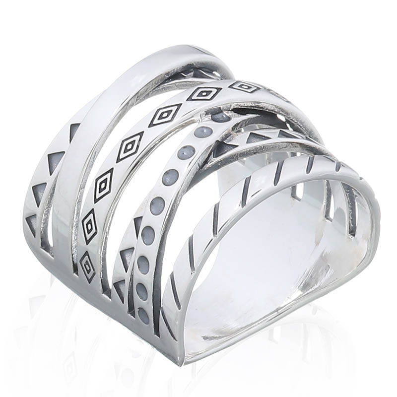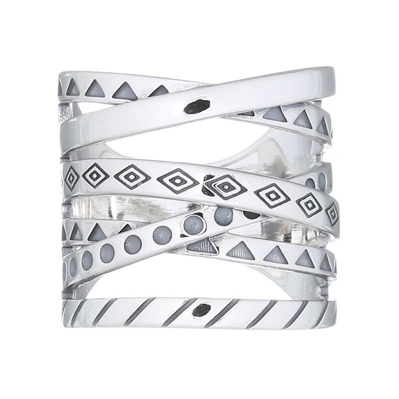 Crossed geometric lines in this sterling silver ring create a modern and artistic design. Ideal for retailers wanting to attract customers who appreciate contemporary styles and bold statements. A striking piece for those who love unique, eye-catching jewelry.