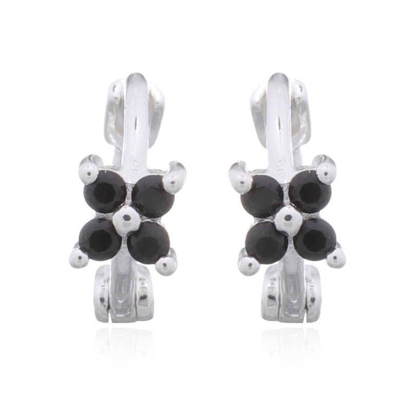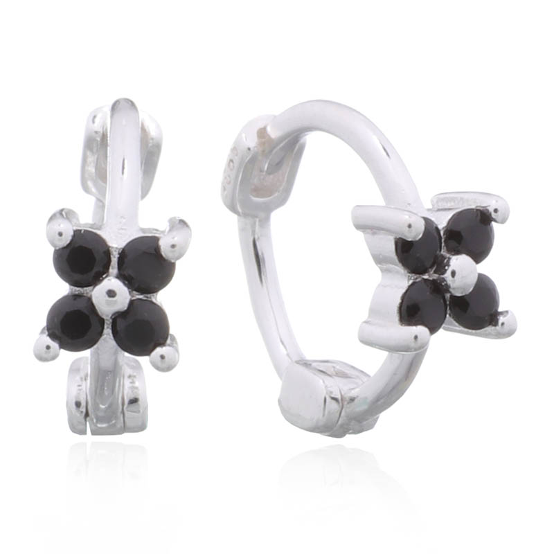 CZ black flower huggie hoop earrings in 925 silver bring a bold yet feminine flair to any jewelry collection. Perfect for customers seeking standout floral designs with a modern twist.