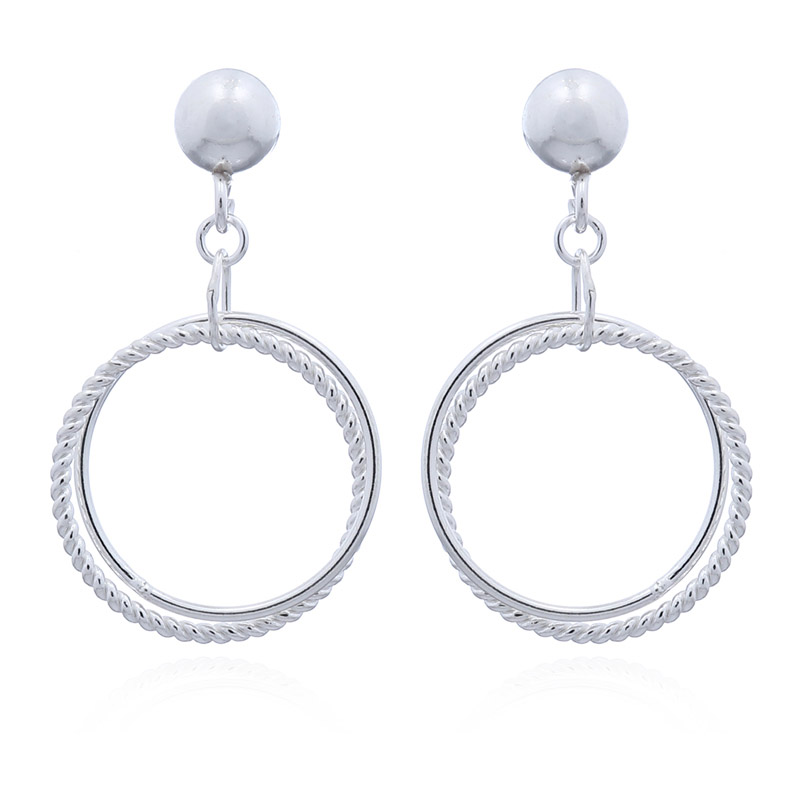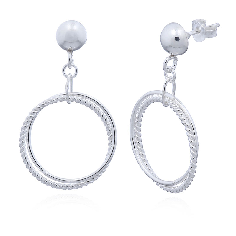 Two circles are twined each in silver ring which is hanging from the semi ball. One is plain silver wire circle ring and other is handmade wire twisted circle. It will be dangling when is hanging on your ears and very stunning.