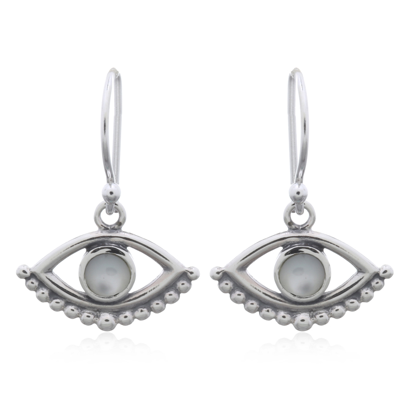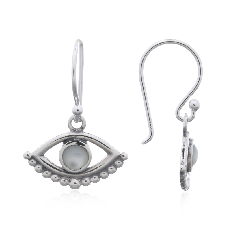These dangling 925 silver earrings with mother of pearl evil eye stones add an elegant and mystical touch. Perfect for a distinctive jewelry collection. Take advantage of our factory-direct pricing.