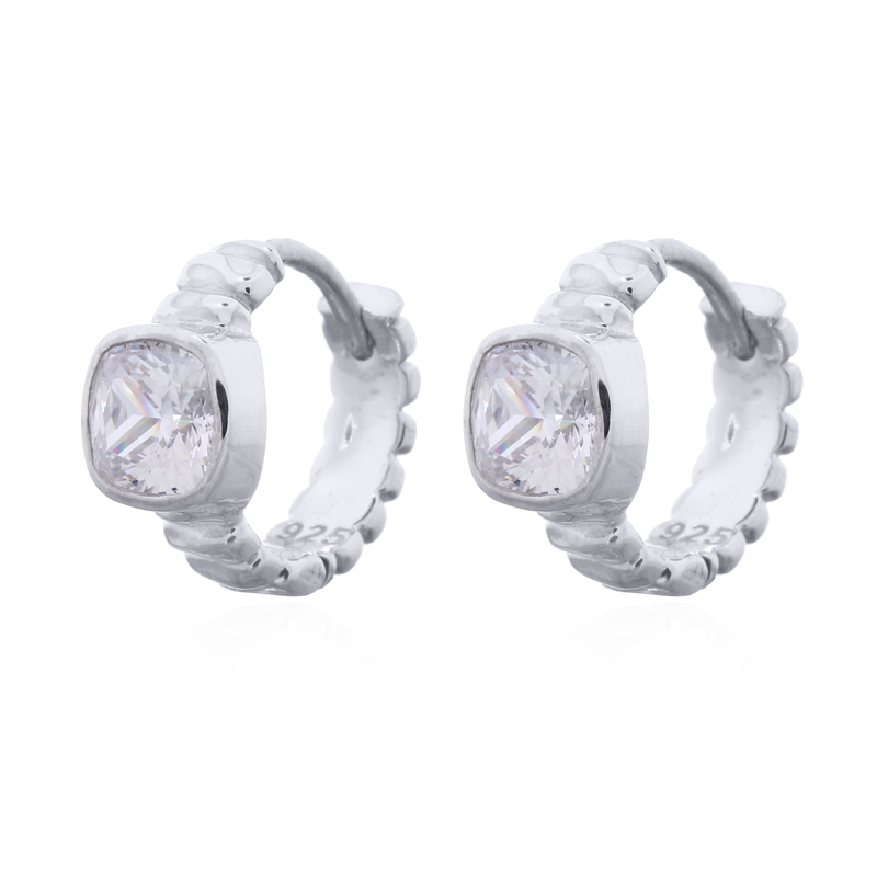 These 925 sterling silver hoops showcase faceted square CZ stones in polished bezels paired with distinctive uneven grain along the band, creating dynamic contrast. Ideal for retailers offering contemporary designs that attract customers desiring edgy texture and enduring brilliance.