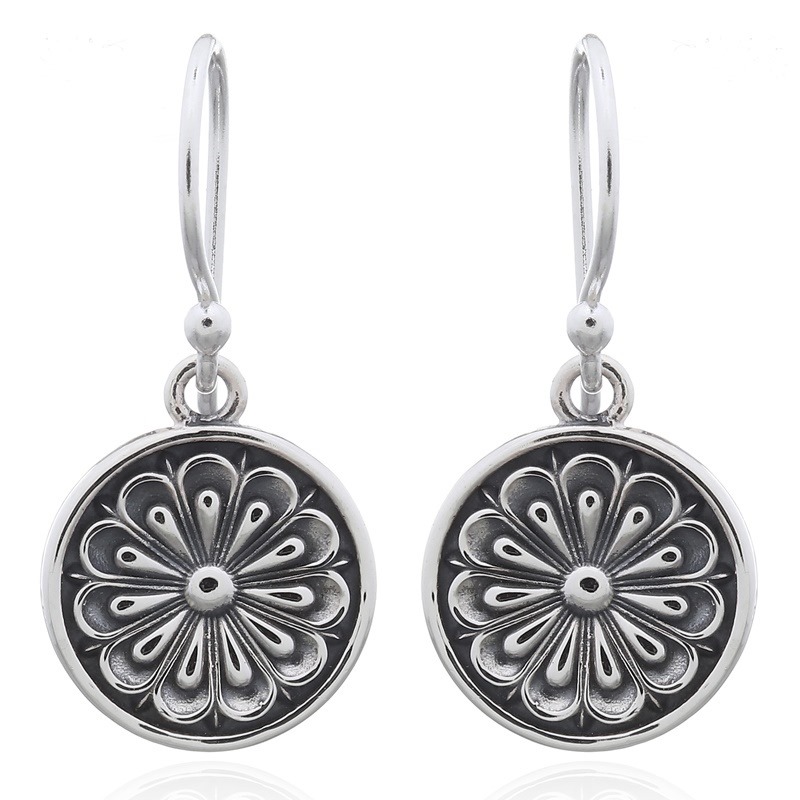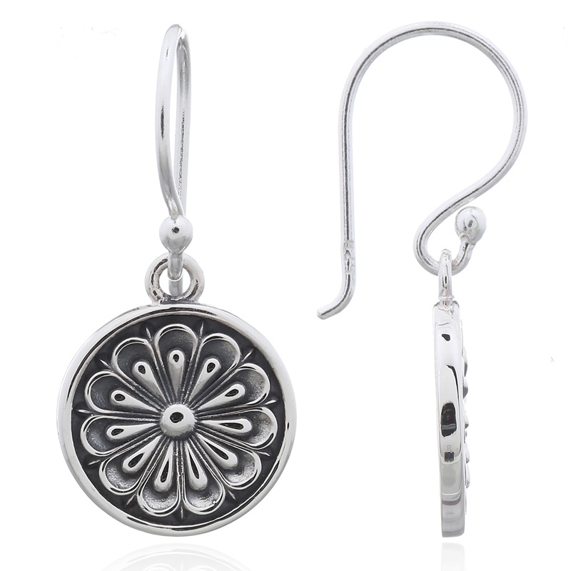 Debossed flower disc dangle earrings in sterling silver offer a beautiful floral design with intricate detail. Ideal for enhancing any jewelry lineup. Benefit from high product quality and competitive wholesale prices.