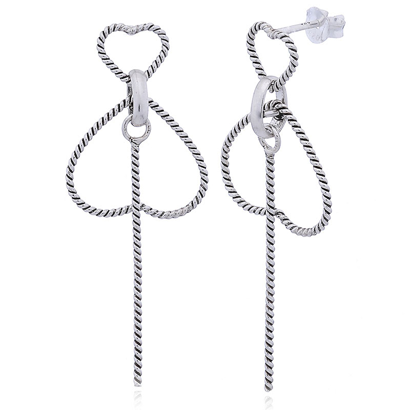 Double heart stud earrings showing a pair of hearts of different size and a straight bar made of twisted wire liked that make them look unique. The larger upside down heart dangles from a bar dissecting the polished silver ring that connects all pieces together. The tip of the straight bar has no sharp edges.