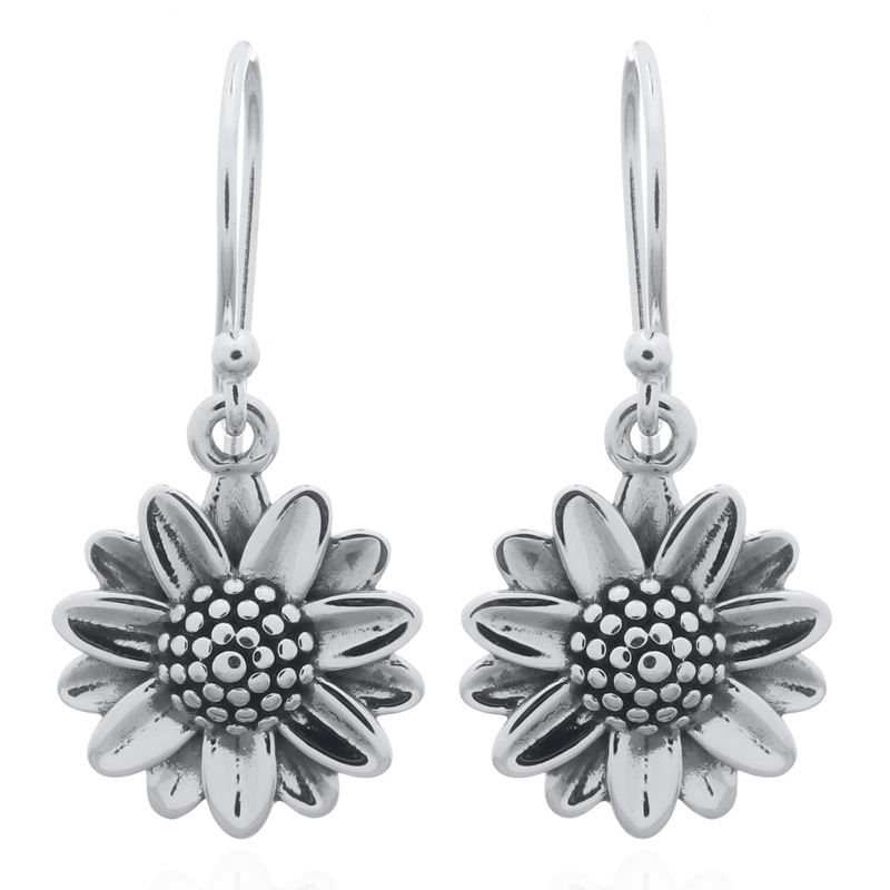 Double row sunflower dangle earrings in sterling silver bring a bright, cheerful vibe to your collection. Their intricate design is sure to attract attention. Our factory pricing offers great value for your store.