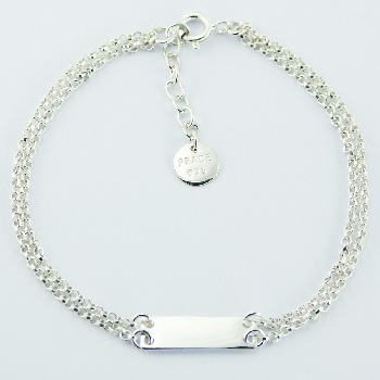 A Silver curb chain is linked to each of the corners of a flat highly polished Sterling Silver rectangle. This rectangle is perfect for engraving names drawings dates or anything that you wish. Each chain unites again at the loops of a silver spring clasp. A small 3 cm chain dangles from one side of the spring clasp for the user to adjust the length of the bracelet. Top quality craftsmanship create an outstanding bracelet. (Dimensions of stamped blank rectangle 12 x 5 x 1 mm).