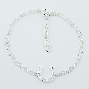 Two lengths of beautiful curb chain wrap around two holes of a Silver horseshoe charm uniting again at the links of a silver spring clasp. The horseshoe is considered a good luck charm since it is believed to fill up with good fortune when its ends are hung pointing upwards. There is an extra 3 cm of chain dangling from one side of the spring clasp for the user to adjust the length of the bracelet. (Dimensions of horseshoe charm 12 x 12 x 1 mm).